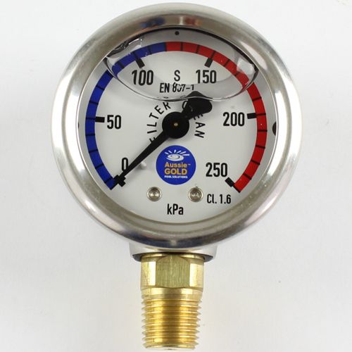 Universal, bottom mount pressure gauge. Measures up to 250 kPa. Gauge is filled with glycerine to prevent moisture damage and extend life. Made from stainless steel - recommended for weather exposed applications.
